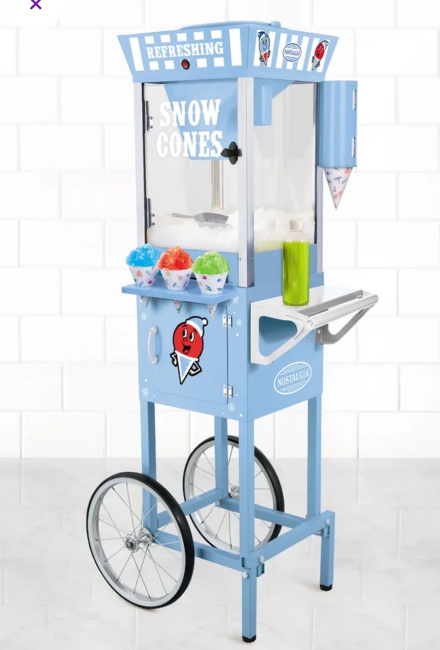 This full-size cart not only holds enough snow to keep the party going, but also features a storage compartment to keep supplies organized. The paper cone dispenser ensures easy serving, while the drip tray keeps everything clean. 🍦